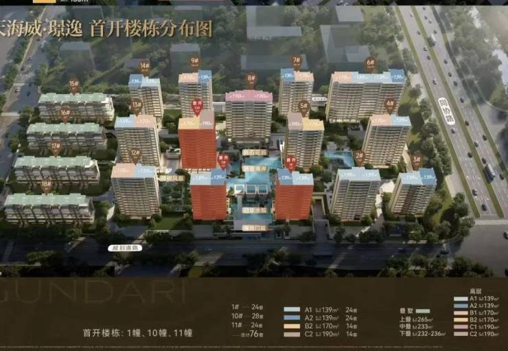 住宅产品线规划科学,高层采用全2T2户设计,建筑层高约3.1米,高层建筑面积约139-193㎡,叠墅产品230㎡-265起步面积实现居住升级,通过空间垂直延展重塑墅居生活美学。