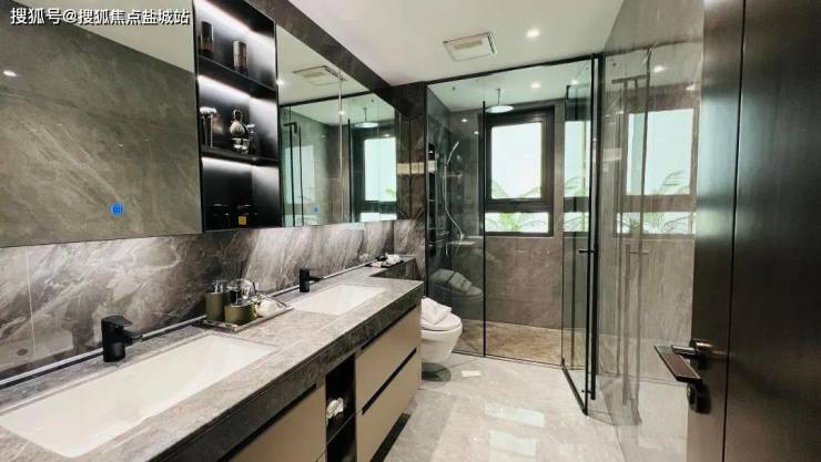 主卧套房更是选用了双台盆,这基本是到了180㎡+才有的配置,并且整个台面采用了整块石材,成本高昂,市面上非常少见!