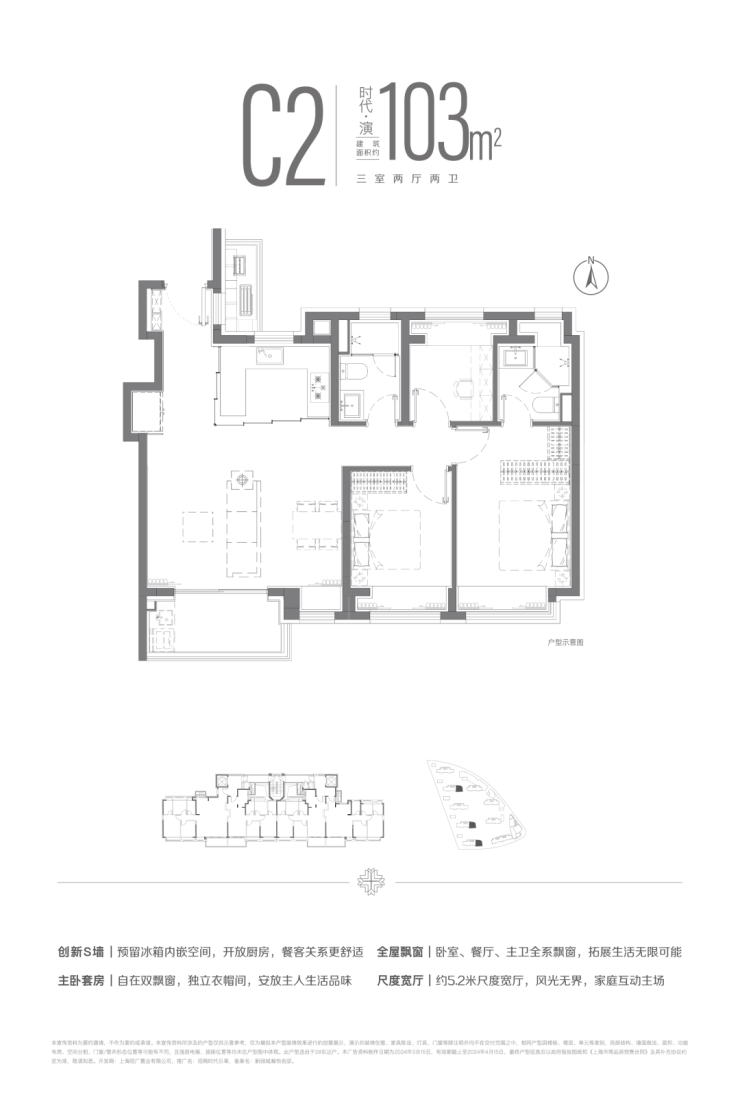 建面约103m²三房两厅两卫户型,南北双卧L型270°揽境飘窗设计,更大限度地让自然融入与自在之中,更宽阔的空间尺度,让自在生长与自然之中。