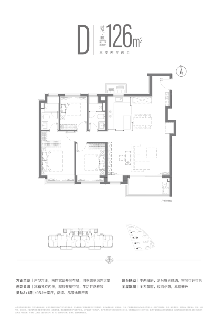 建面约126m²三房两厅两卫户型,南向3+1面宽横厅设计,让空间更加随心而变。主卧双台盆配置,用空间拥抱自然中的无限自在。