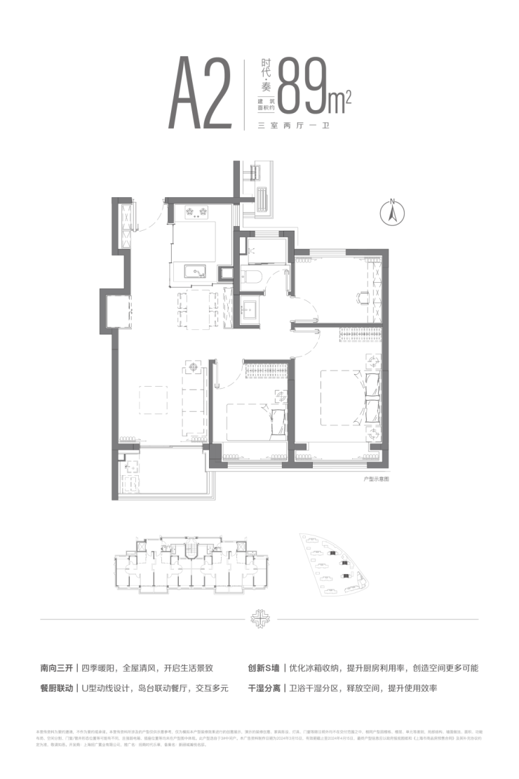 建面约89m²三房两厅一卫户型,LDKB一体化设计,南向三开间布局,全明空间设计。让四季流转于生活之中,用自然营造生活的惬意。