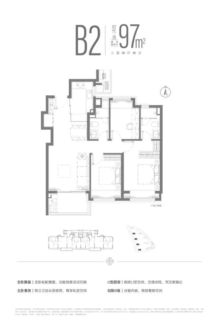 建面约97m²三房两厅两卫户型,全卧+主卫飘窗配置,并通过飞机户型空间布局,提升了空间的使用效率,让温情在自然中自然发生。