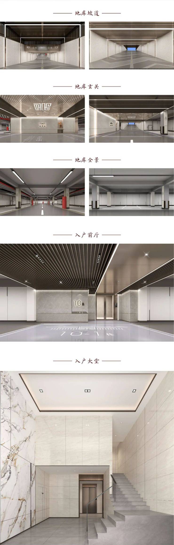 项目还规划五大机动车归家模块,包括坡道、地下玄关、大地库、入户前厅、入户大堂,链接城市界面和家之间的枢纽,无限延伸家的空间感,凸显业主尊崇归家仪式感。