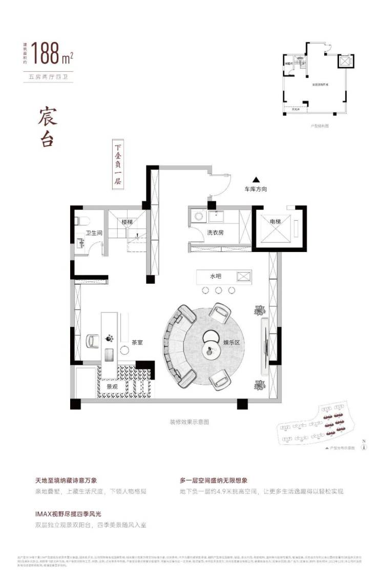 户型亮点:地下负一层约4.9米挑高空间;双层独立观景阳台;超豪华独立主卧,联通阳台,配备超大卫生间和衣帽间;客卫干湿分离设计。