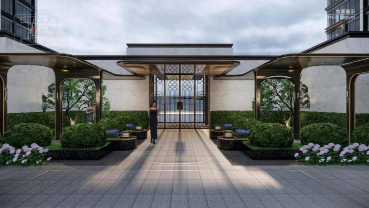 比如“原生围合社区”、风雨连廊,从高奢酒店中获得灵感的酒店式落客区、度假风园林,以及千万级住宅中都不多见的下沉式会所!