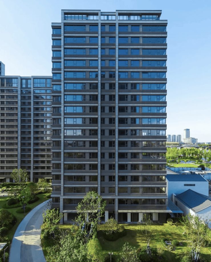 走出交付区,抬头便望见颇具辨识度的外立面。大面采用玻璃幕墙与石材一体板,打造“Super Flat”超扁平极简美学风格,搭配绿城经典ART GRAY高级灰色调,淬炼历久弥新的建筑立面。项目较高的窗地比,不仅让建筑成为运河畔的风景,也让未来居住在这里的业主家人们,在房间里既能沐浴满室阳光,也能饱览室外美景。