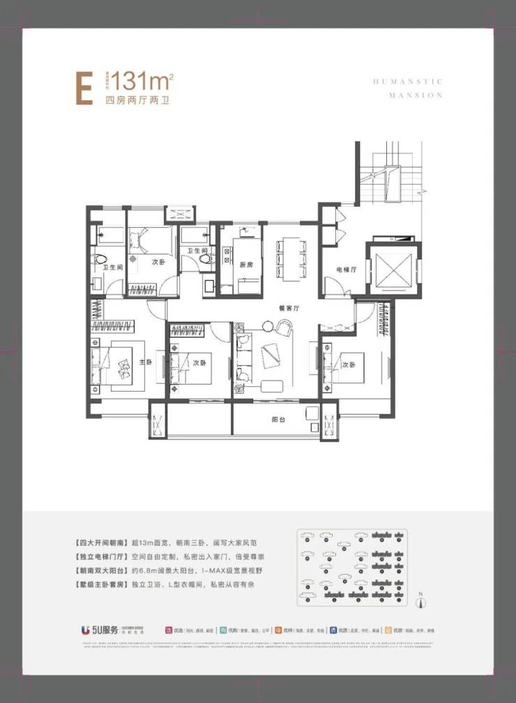 双开门电梯,约10㎡独立电梯门厅;得房率约81%;四开间朝南,南向面宽超13米;南向双联阳台面宽约6.8米;扬州人热爱的飞机户型,减少客卧/老人房与主卧起居干扰;主卧套间设计,生活品质感更好。