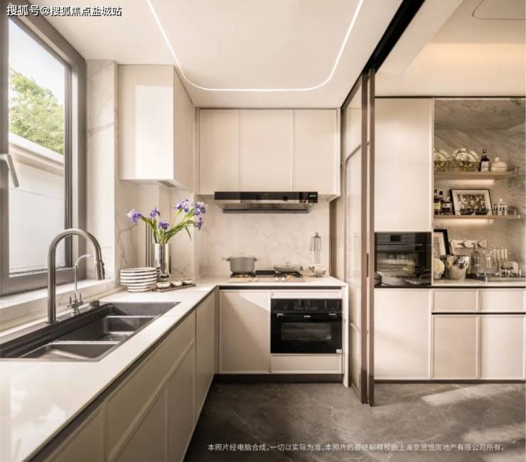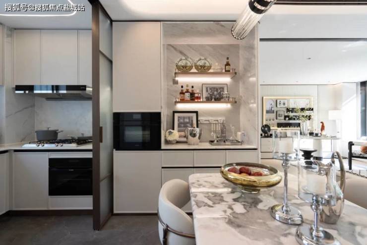 比如,厨房和餐厅中间用无地面链条设计的海派金属玻璃移门隔开,地砖能通铺更美观,也方便扫地机器人通扫全屋。同时还标配中西双厨。