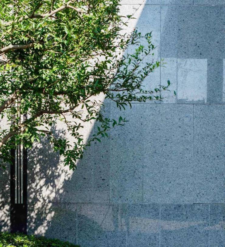 酒店式归家前场 ,两侧景墙铺满蓝眼睛天然石材,说不出的贵胄气场。
