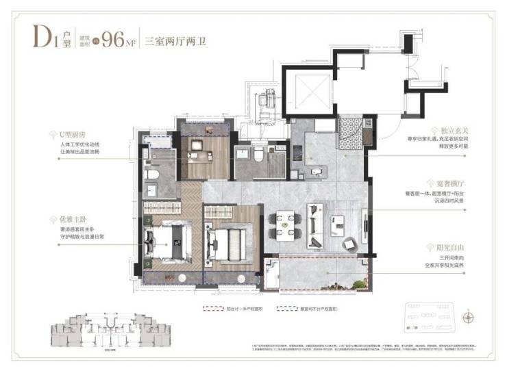 ①建面约96㎡3房户型: