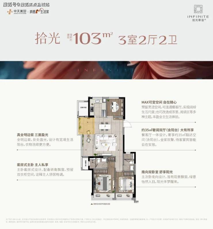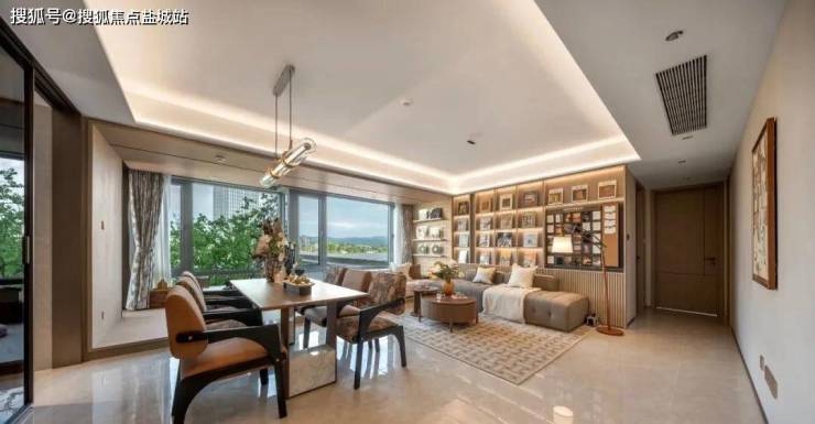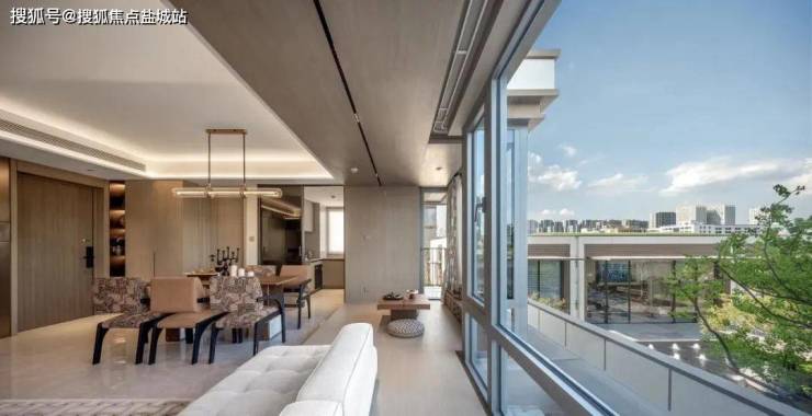建面约103㎡的边套更是堪称神迹,将小户型的空间魔法玩到了极致。客厅到阳台的地面、天花直接拉通,甚至两侧的墙垛都已隐身,整个餐客厅面积达到约35㎡(含阳台),这可是140㎡以上大宅才有的空间感!