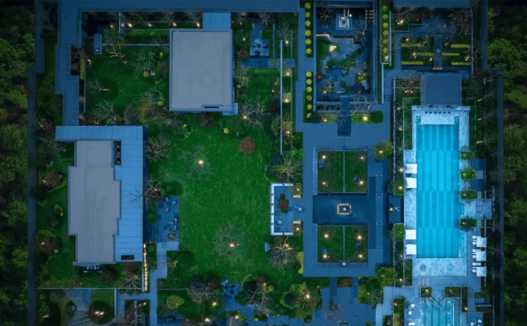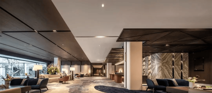 约2000m²交流空间,目之所及皆风景,四水归堂,藏风聚气,营造东方意境,8棵榉树树阵列席,致敬归家礼序