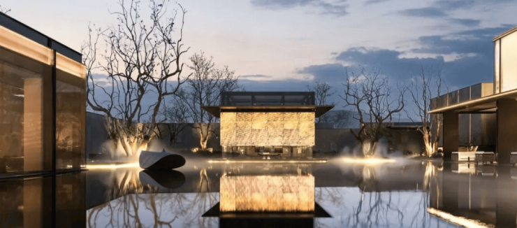 约1000㎡镜面水景,引创山川相汇,“樾知亭”悬浮于上,勾勒禅意心境,卡拉拉白雕刻透光玉石,紫铜金属奢制