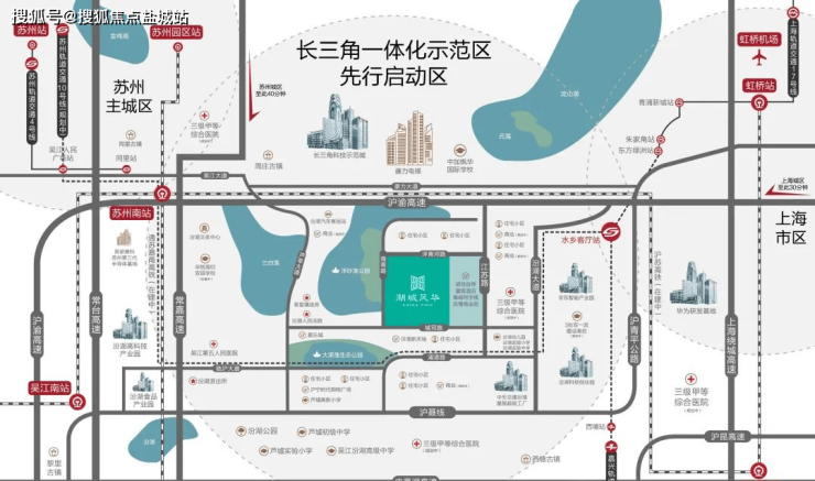 苏州南站(汾湖站)位于长三角一体化先启区——汾湖,沪苏湖铁路、通苏嘉甬城际高铁于此呈“十字”交汇,其中沪苏湖铁路由上海虹桥枢纽引出,途经上海松江、苏州吴江,至浙江湖州站,通车后将实现由汾湖8分钟到松江,20分钟到达上海虹桥枢纽,将汾湖与上海更紧密的联系在一起。