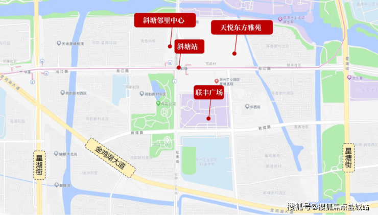 距金鸡湖东岸约1.5km,北邻十里斜塘母亲河,依水而居,环境优越;