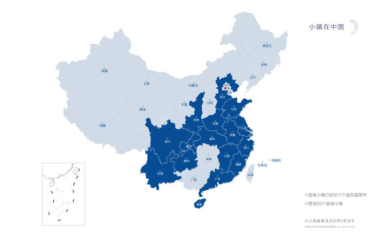 蓝城集团由宋卫平先生带领绿城核心团队和优秀资源组建而成。自2016年起,一座座蓝城小镇在全国掀起中式热潮,成为无数人的心中向往。目前蓝城小镇已进驻中国17个省及直辖市,营造89个蓝城小镇。(以上数据截至2022年2月28日)