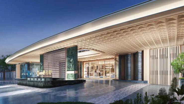 星级酒店式环岛落客,超50米奢石双翼展面,约4米挑高香槟金色星空穹顶。