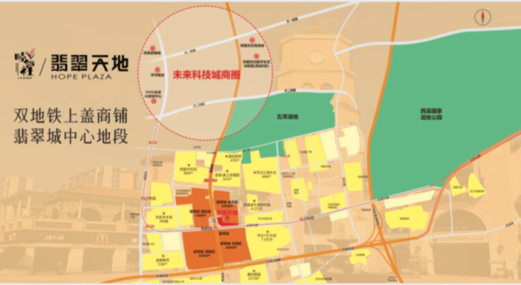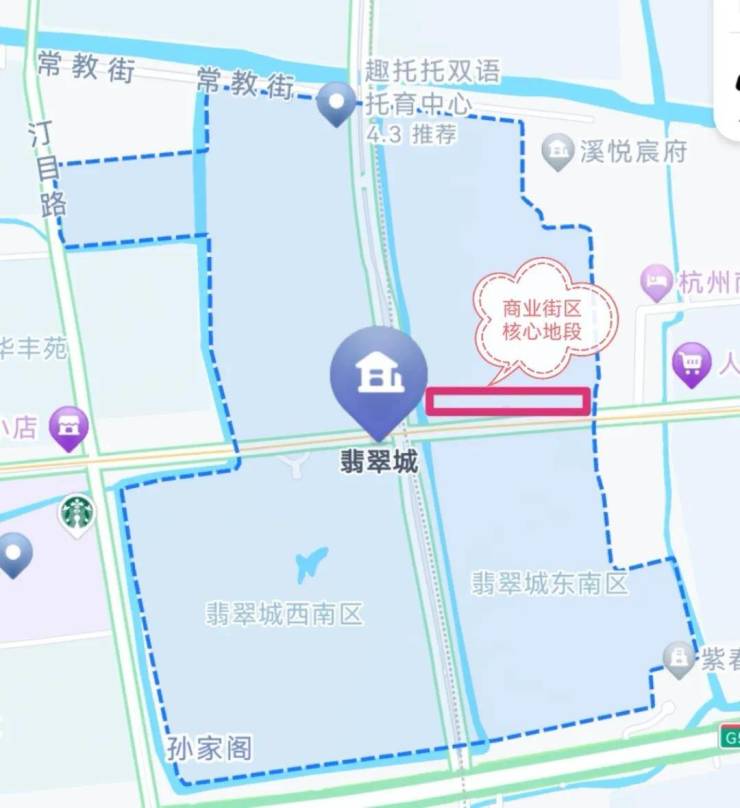 绿城翡翠城以五常大道和高教路交叉口为中心,分为东南区一期,东北区二期,西南区三期和西北区四期共同组成了一个超级大盘,从开发到管理全部是绿城的。