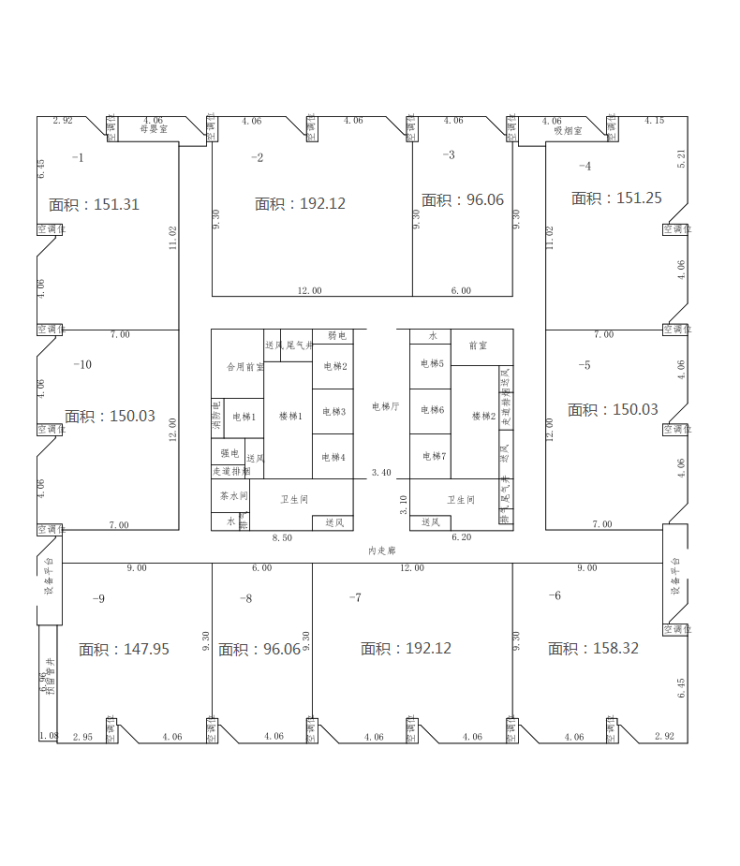 面积段:一层10套,面积约96-190平方米,整层面积约1500平方米