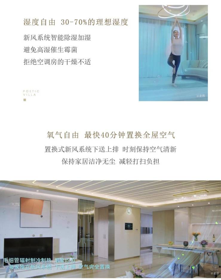 采用地源热泵系统+毛细管网辐射系统,制冷采暖无死角;健康空气交互体系,置换式新风系统,智能加湿除湿时刻保持室内空气的清新和健康;LOW-E中空玻璃结构,有效降低噪音干扰;电动外遮阳卷帘(部分窗户配置),实现声光自由。