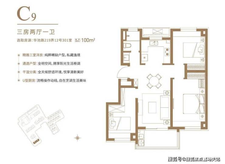 建筑面积约105㎡3房2厅2卫,动静分区,各个功能分区动线流畅,家庭成员之间既能良好互动又能各取所需。主卧和次卧都做了飘窗,空间的宽阔感大大提升,采光也更好,同时增加了收纳空间。U型厨房的设计、干湿分离的卫浴、套房式的主卧等等。