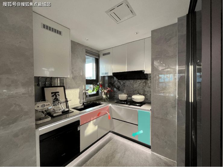 厨房L型设计,配有方太油烟机、燃气灶、嵌入式洗碗机,特别配置前端净水器和厨房凉霸。摩恩大单槽,放得下炒锅汤锅,抽拉式龙头,可以360度无死角清理!