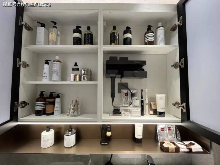 主卧卫生间,镜柜别出心裁的配有“美妆冰箱”,可以满足业主对美妆用品冷藏的需求!可以说,上海10万+单价的项目中也没几个项目可以做到这么细致的。