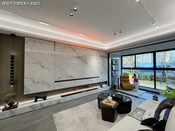 全屋墙布交付,客厅背景墙采用木质格栅+大理石岩板的组合,拉升了整体的美观程度——这些也是交付的。