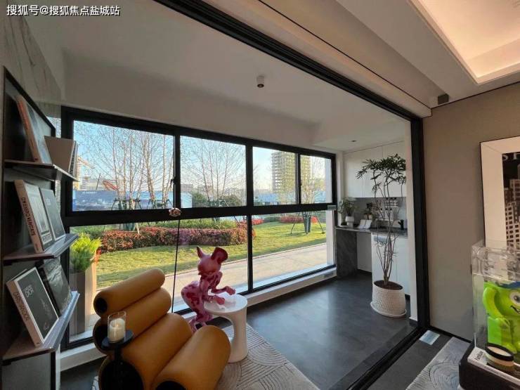 而阳台和客厅之间是无墙垛设计的,实际交付时不封阳台(此处为临时样板间),可以想象,走进室内一眼望去只有窗外的风景,整体空间是非常通透敞亮的。