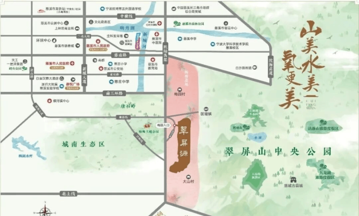翠屏源是慈溪界内首个在翠屏山中央公园内的在建住宅项目,翠屏山中央公园规划区内暂时已停止供应开发建设住宅土地,目前在建项目将成为翠屏山“臻稀藏品”。