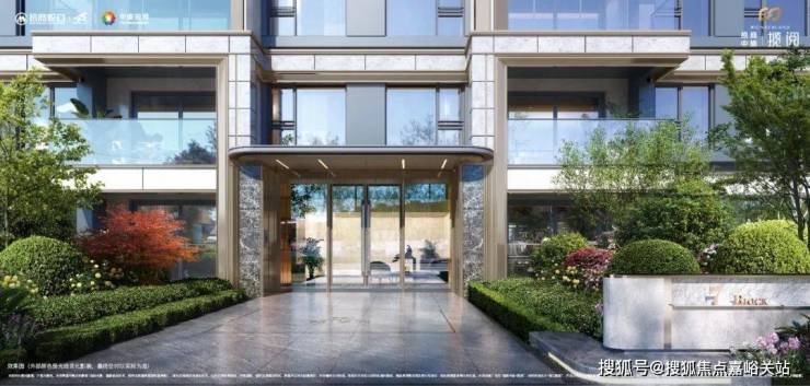 采用香槟金铝型材与灰色石材的入户大厅外墙,香槟金色弧形铝板装饰的门头雨棚,搭配大玻璃面更加通透近人,营造颜值与尊贵并存的归家体验。