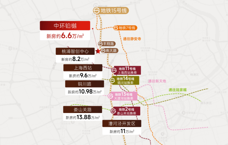 中环铂樾坐拥15号线南大路站(直线约300米),真正实现“地铁到家”的便捷生活。从这里出发, 4站畅达上海西站、5站轻松抵达铜川路、9站直达娄山关路,轻松串联城市核心板块。此外,15号线更可快速换乘2/7/11/13/14号线,无缝衔接大宁、虹口、陆家嘴等繁华商圈,商务出行、休闲娱乐皆高效无忧。