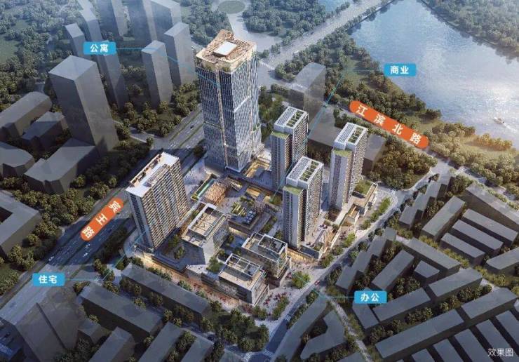 产品形态:国际潮流商业街区、花园式商务办公、一线瞰江精品公寓、现代美学住宅