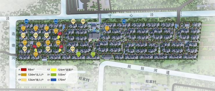 项目占地面积约9.4万㎡,总建筑面积约7.5万㎡。容积率约0.41,整体规划282户独栋合院,地上2层,地下1层。本案北至名叫“寸心泾”的内部河流,北侧紧贴上海协和高尔夫俱乐部球场,西接连塘河,通过内部园区道路与嘉行公路相连接。整个小区三面环水,取聚水为财之意,寓意能藏、能聚、能蓄之地。