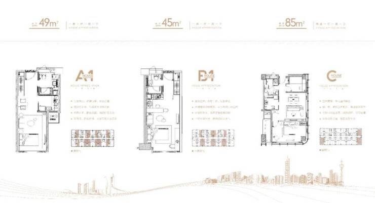 【户型布局】主力户型45-85㎡一至二居,南北通透设计,双厅一体阔绰空间,干湿分离卫浴,全屋品牌精装交付,部分户型可通燃气,即买即住,省去装修烦恼。