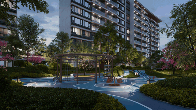 除此之外,社区横向规划超200米景观长廊,全龄段的儿童乐园、新中式山水园林、约360米四季环跑道、高互动性戏水池,以及约1300㎡下沉庭院会所等丰盛配套镶嵌其中,于此,看长者品茗,悠享闲适岁月,或陪孩子天真释放,亦可运动一番,与志趣友邻较量,交织出别样的诗意日常。