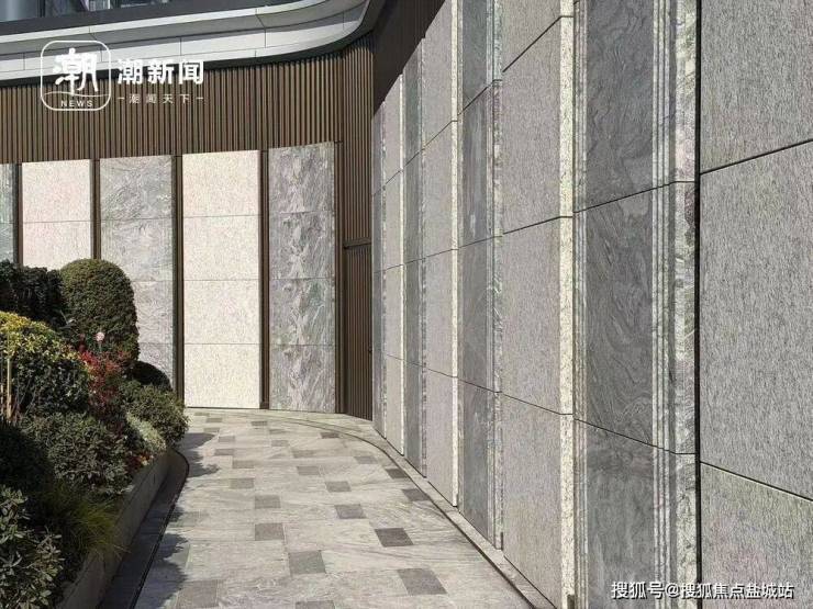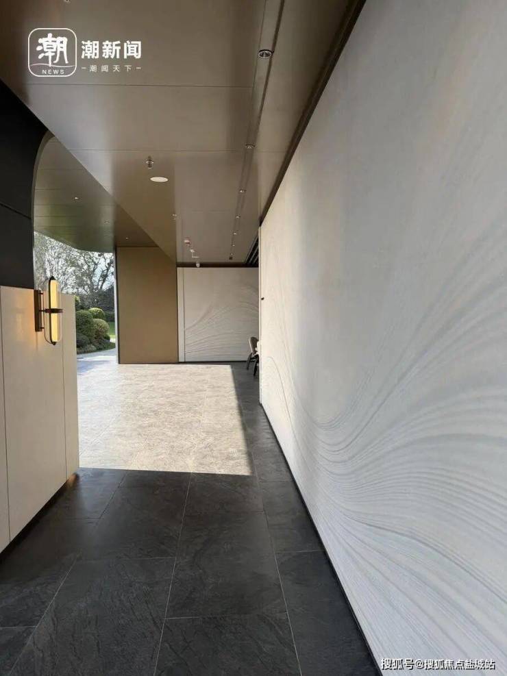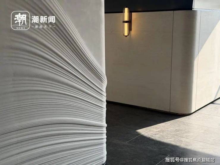 架空层过道墙壁铺满大面积的米白色奢石,有着如绸缎一般的纹路,走近才能看出是直接在石材上雕刻出来的。