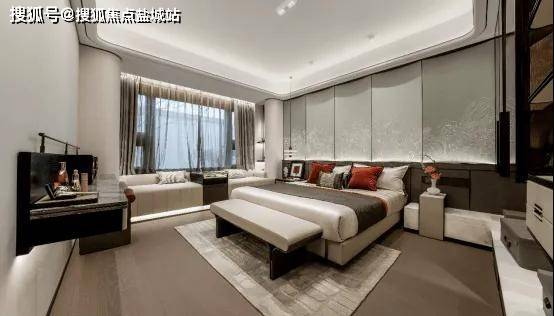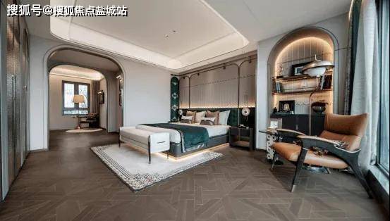 餐客厅一体化设计,让室内享有更充沛的采光的同时,极大地延伸了整个空间的边界和景观视野。主卧套房采用观景飘窗设计,扩大了室内的采光视野,更大大地增加了空间使用率和通透性。独立卫生间、衣帽间等设计,让整个空间享受星级酒店般私密尊荣。