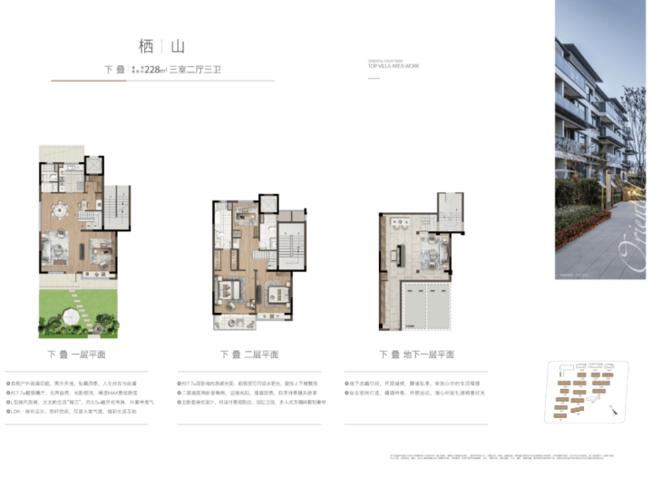 产品特征:建面约210-280㎡山水生态院墅、上下叠单独入户、户户有院、5.4M挑高地下室