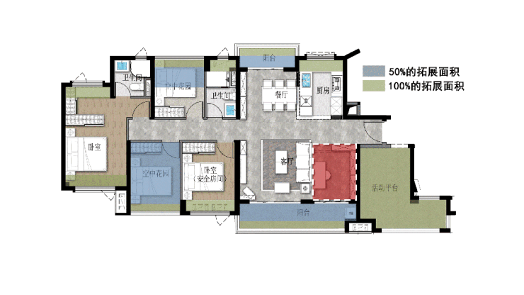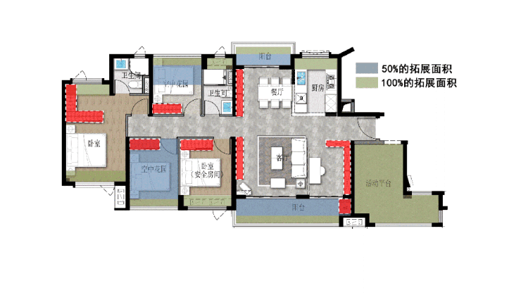 反倒是,业主日后如果有需求,可以将客厅空间适当升级,既可以做“第三厅”,又可以做多一个房间,相当于建面约126㎡能做3+2+X房!