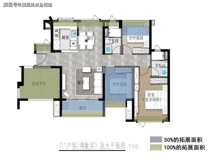 而且空中庭院都是分布在入户大门旁,更为方正实用,日后改造升级的可能性也更多,麻将室、储物间、甚至小花园都可以实现,真正小面积也有大享受。