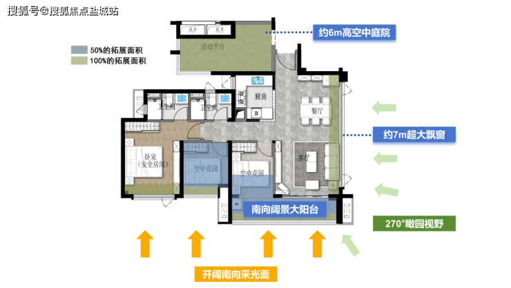 颠覆地在客厅设计有约7m宽的超大飘窗,跟南向景观阳台相连,形成一个270°的环幕观景舱,园景、河景、墅景,一览无遗!