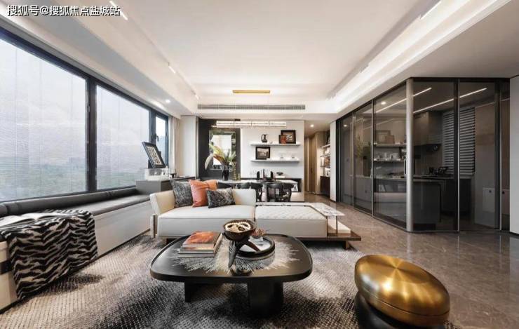 玻璃移门可最大化敞开,让厨房轻松融入餐客厅,将LDK设计充分体现,形成一个面积约40㎡的尺度空间,大气又敞亮!客厅配备近6米长飘窗,阳光清风延引入内,通透明亮。周末家里来客人时,一体化大空间是承载宾主尽欢的主场,彰显着主人的品位与气度;日常休息时,也可以躺在沙发,全家一起观影、阅读,装下生活温暖的点滴。