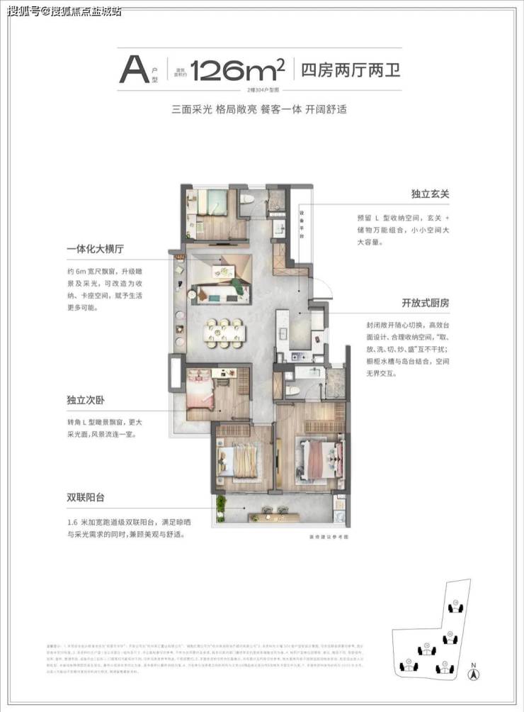 建面约126方户型:预留大进深转角玄关柜,为换季衣物提供了储藏空间。次卧的L形飘窗让清晨洒下的阳光更加饱满。