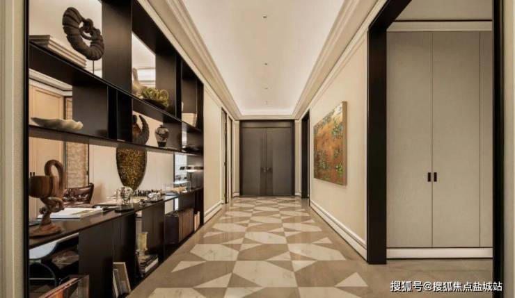 地面是几何拼花石材,墙面装饰白色实木线条——就像一座“小卢浮宫”,一进门就能秀出主人收藏的画作、游历世界的照片。