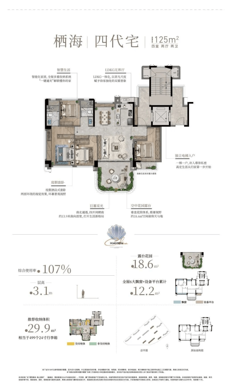 作为会展新城首个四代宅项目,海上雅颂主推78-132㎡三至四房,覆盖刚需、改善需求,整体得房率约84-107%。其中,高层层高约3米,四代宅层高约3.1米,整个空间感会更通透。