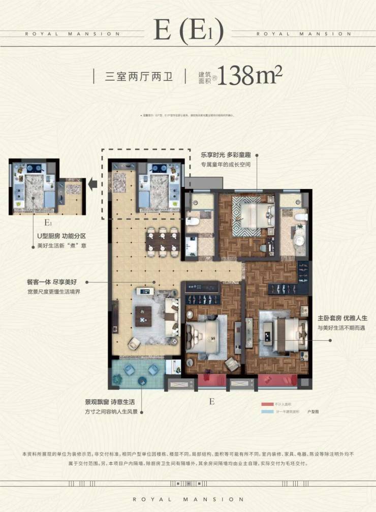 壹号公馆约112/138㎡新品高层户型,简洁、宽敞的U型厨房区,根据人体工程学设计操作动线,操作台分区更明确。