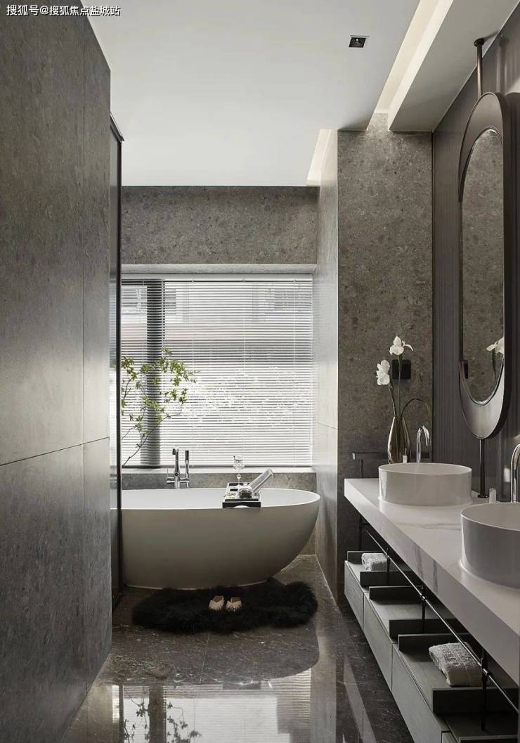 卧室空间表达的是都市新贵对于繁华与质雅的思考,浮华过后终归寻求自我的沉静,褪去华丽的形态与材质,感受到那一份舒适与安宁。卫浴空间,运用了现代艺术化的手法,隐隐约约具有东方的气质,灰白调性的运用亦是经典。
