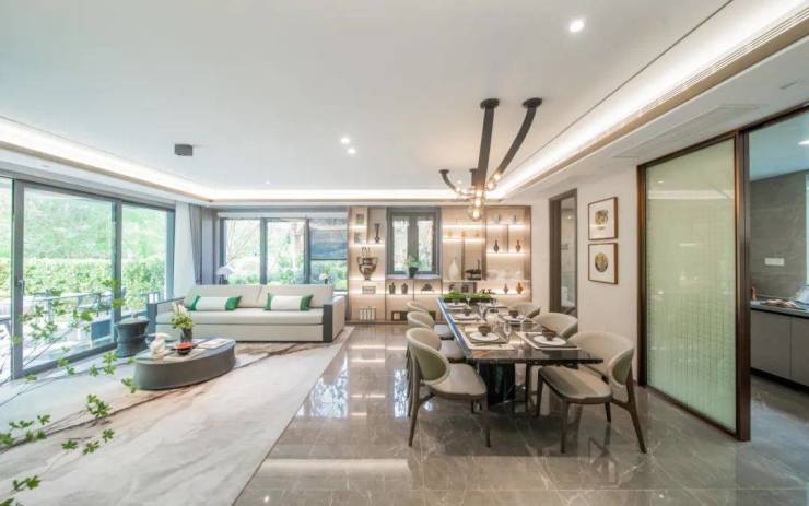 外立面,白色石材、香槟色的木纹铝板、大面积玻璃的拼接组合,怎么看都不像一个门槛只有400万+的低密叠墅。玉琮水景、山石跌水等等融入景观的大量良渚文明元素,弥漫着专属于杭州的千年气韵。满眼的“越级感”再配上只有1.2的超低容积率,最终才呈现出一座全低密真双叠大盘的样子。