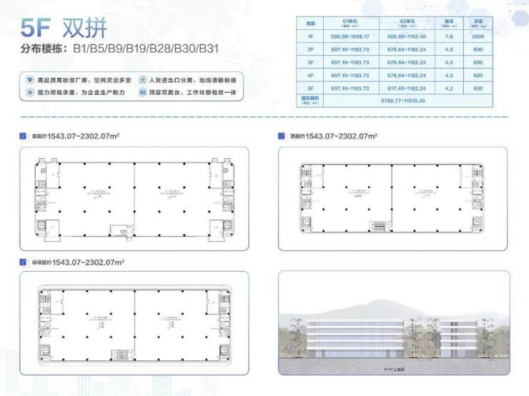 2⃣5F分层厂房首层层高:6m、二层至四层:4.5m、五层:4.2m;